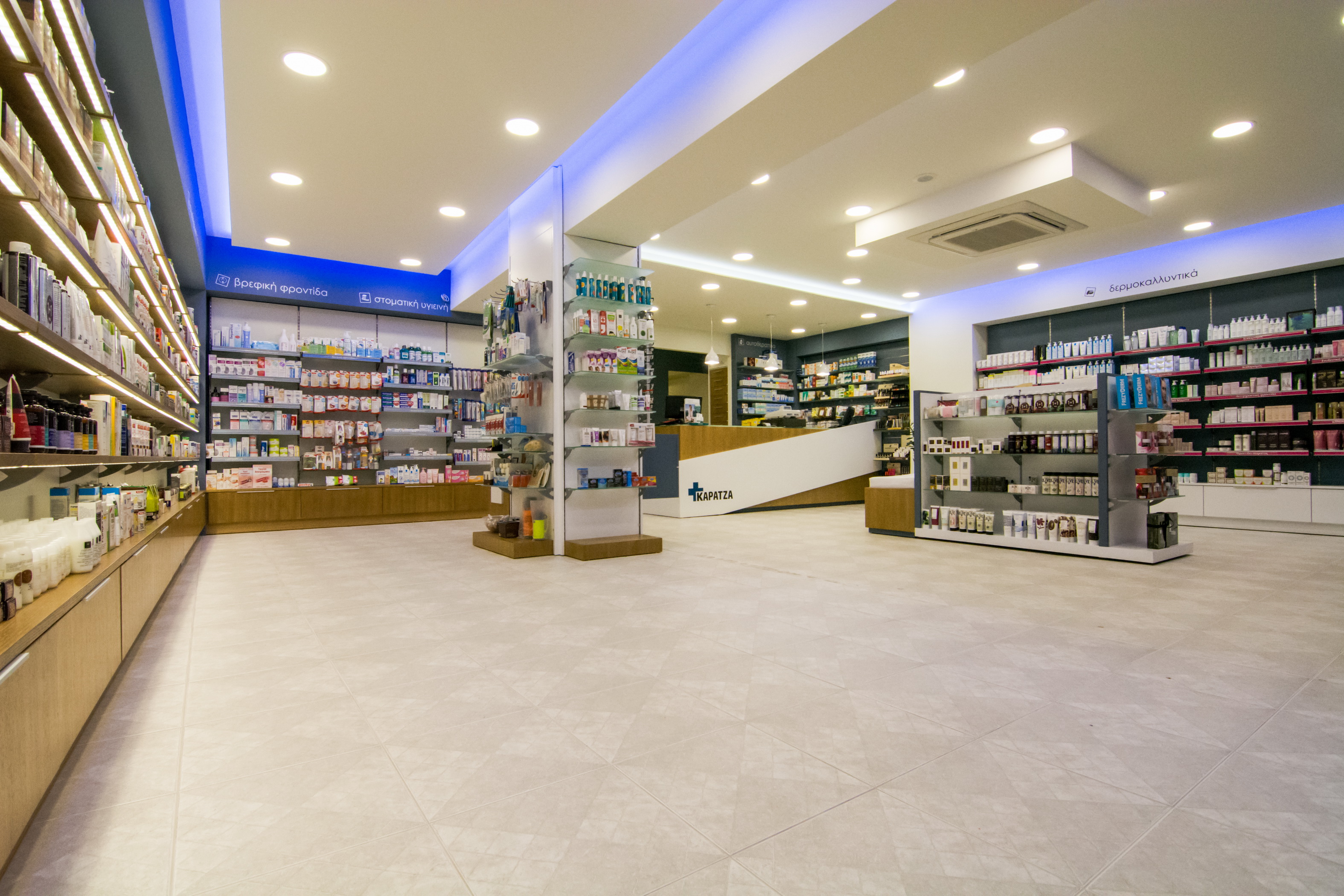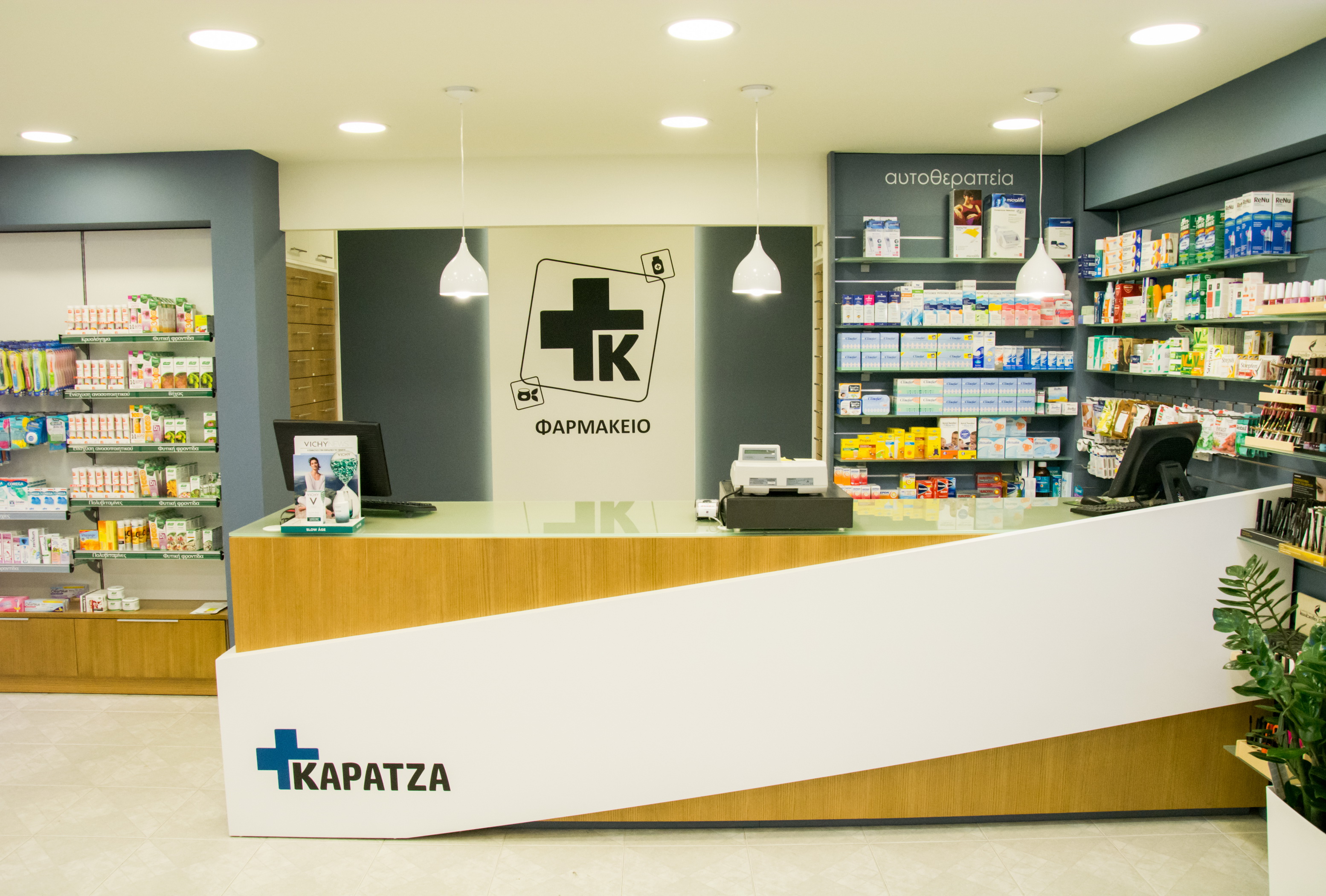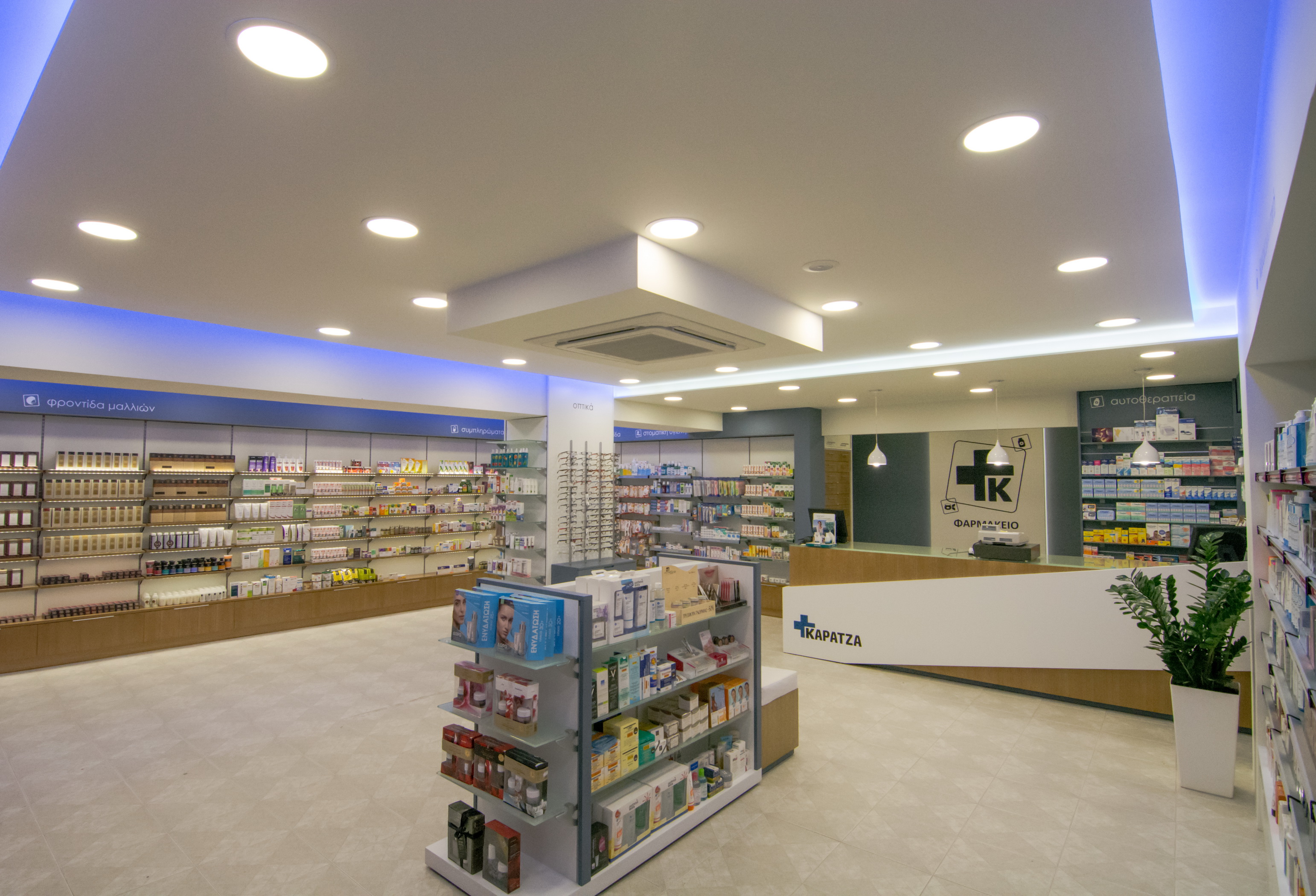 Στην Αρτάκη της Εύβοιας, το φαρμακείο της κας. Καρατζά μεταμορφώθηκε από ένα συνοικιακό φαρμακείο σε ένα σύγχρονο και άνετο κατάστημα. Ακολουθήσαμε το όραμα της φαρμακοποιού για ένα νέο χώρο, με μοντέρνο ύφος και ικανό να προσφέρει ποιοτικές υπηρεσίες υγείας στους πελάτες του. Έτσι λοιπόν το νέο φαρμακείο της κας. Καρατζά στεγάζεται πλέον σε νέο κατάστημα (140 τ.μ), που το χαρακτηρίζει η σύγχρονη αισθητική, οι μεγάλοι και εννιαίοι χώροι και αποπνέει φιλικότητα.
