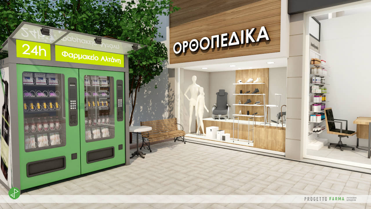 Ειδική Διαμόρφωση Χώρου Αυτόματων Πωλητών στον περιβάλλοντα χώρο του φαρμακείου με κατασκευή επένδυσης - σκέπαστρου και αυτόνομων επιφανειών σήμανσης για λειτουργία 24h.