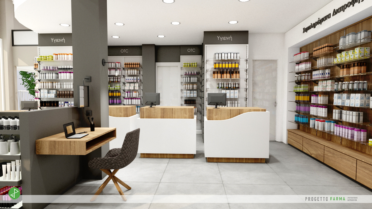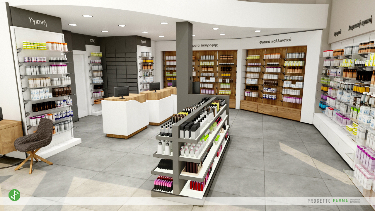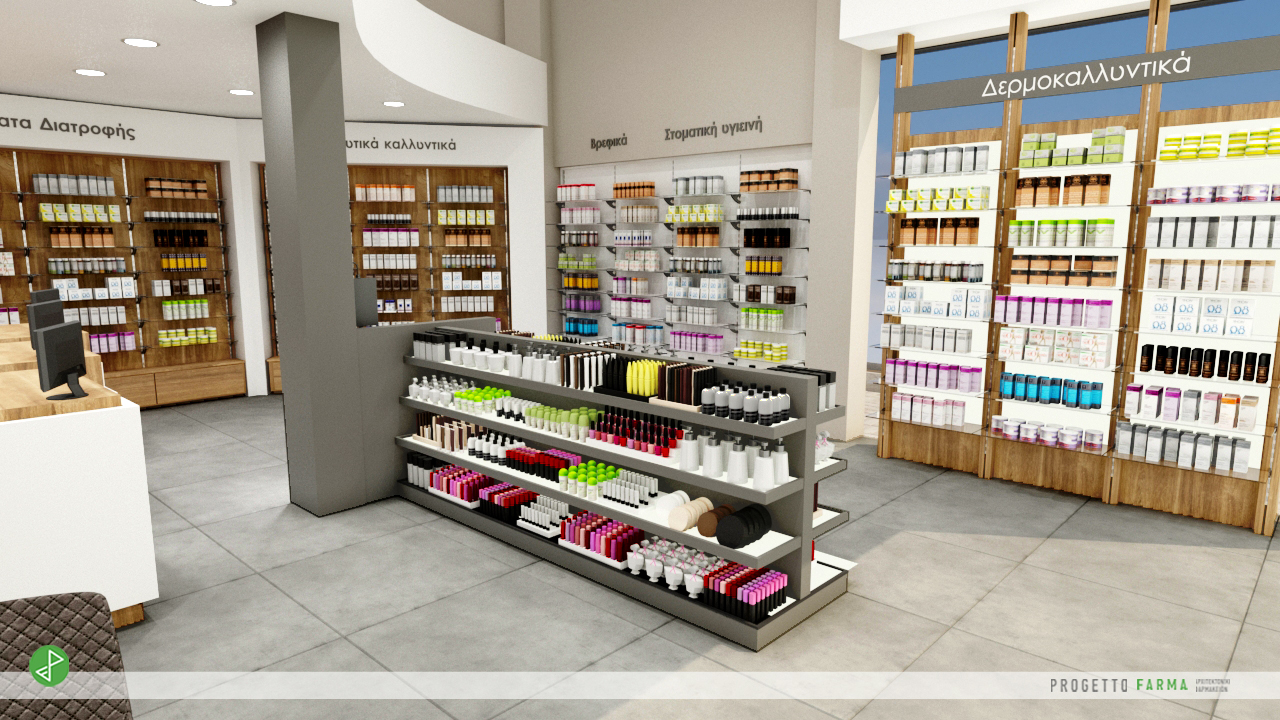 Το φαρμακοπωλείο τοποθετήθηκε στην πίσω αριστερή πλευρά και σε διαγώνια θέση σε σχέση με την είσοδο. Αυτόματα η κίνση των εισερχόμενων πελατών γίνεται από την δεξιά πλευρά της κολώνας με αριστερόστροφη πορεία και έχοντας οπτική επαφή με το σύνολο των εκθετηρίων. Στην δεξιά και πίσω εσωτερική όψη έχουν σχεδιαστεί εσοχές εκθετηρίων με εναλλαγές σε στυλ, χρώμα και υφές. Η κάθε διαφορετική καατσκευή φιλοξενεί και μια ξεχωριστή κατηγορία προϊόντων.