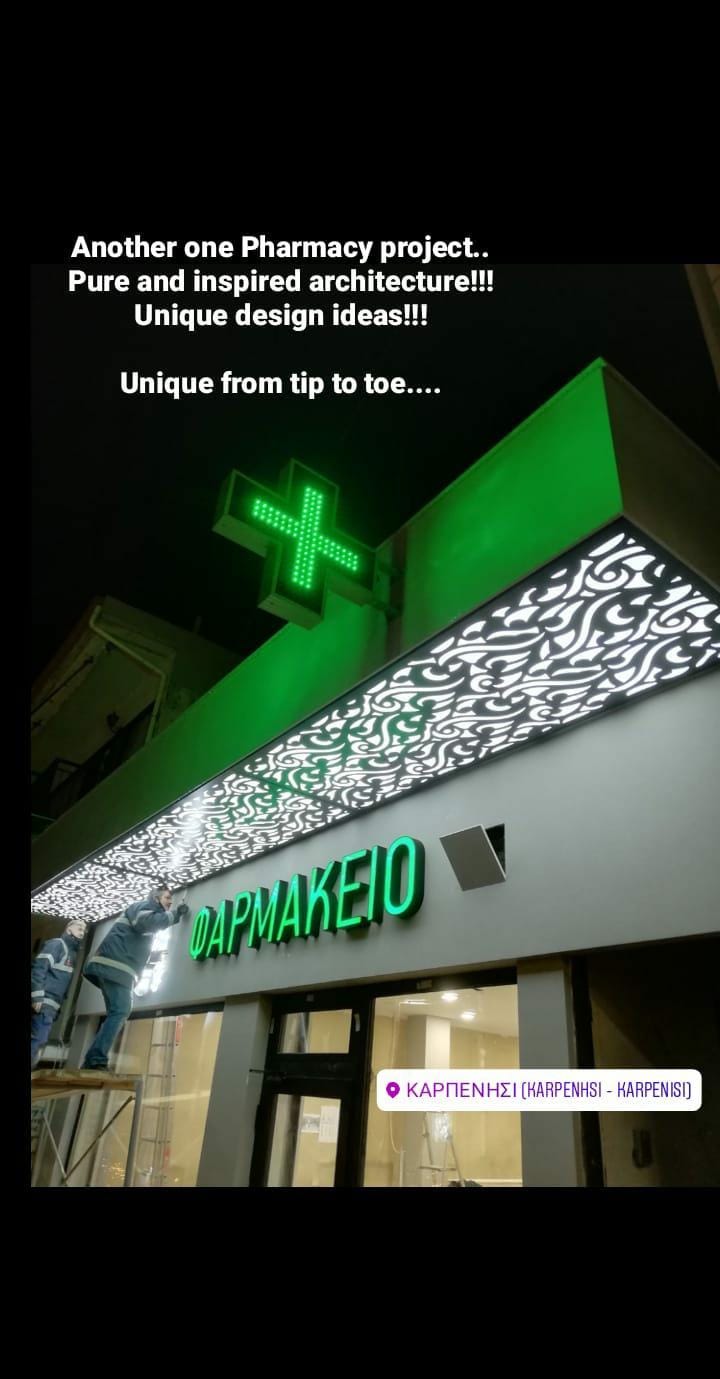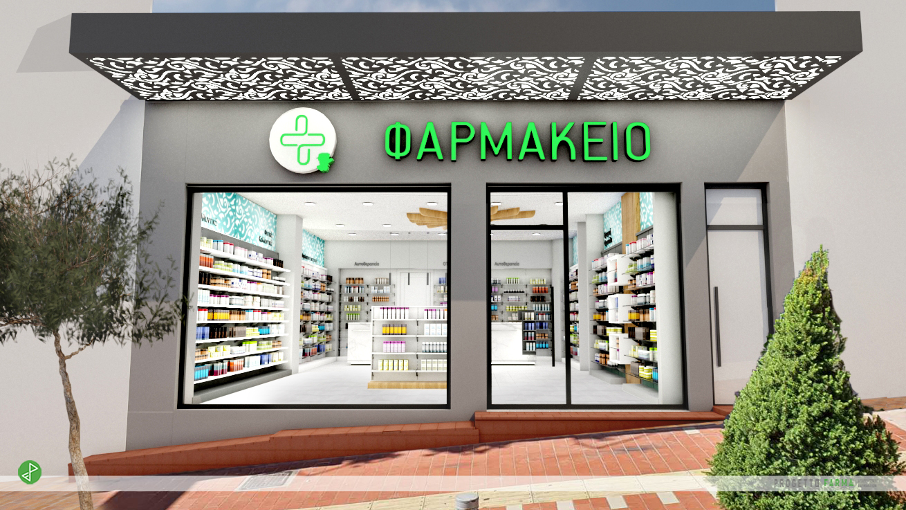 Ξεκινώντας από την εξωτερική όψη του φαρμακείου οι θερμοί χρωματισμοί των επιφανειών συνδυάστηκαν άψογα με τα μαύρου χρώματος κουφώματα αλουμινίου και τις 3D επιγραφές του φαρμακείου. Το σημείο όμως που ουσιαστικά ξεχωρίζει είναι η επένδυση της κάτω πλευράς του μπαλκονιού από ειδική κατασκευής διάτρητες επιφάνειες αλουμινίου με εσωτερικό φωτισμό LED.